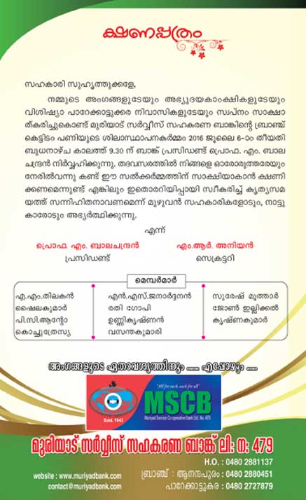| മുരിയാട് സര്വ്വീസ് സഹകരണ ബാങ്കിന്റെ ഓണച്ചന്ത ബാങ്ക് പ്രസിഡണ്ട് എം.ബി രാഘ വന് മാസ്റ്റര് നിര്വ്വഹിച്ചു. ബാങ്ക് പരിസരത്ത് ചേര്ന്ന യോഗത്തില് വൈസ് പ്രസിഡണ്ട് എ.എം തിലകന് അദ്ധ്യക്ഷത വഹിച്ചു. ബാങ്ക് സെക്രട്ടറിഎം. ആര് അനിയന് സ്വാഗതവും,ഡയറക്ടര് പി.സ് ഷൈലകുമാര് നന്ദിയും പറഞ്ഞു. പഴം, പച്ചക്കറികള്, പലവ്യഞ്ജനങ്ങള് എന്നിവയുള്പ്പെടുന്ന ചന്തയാണ് ആരംഭിച്ചത്. കൂടാതെ രോഗികളും നിരാലംബരുമായവര്ക്ക് സൗജന്യ ഓണകിറ്റുകളും വിതരണം ചെയ്തു. | ||