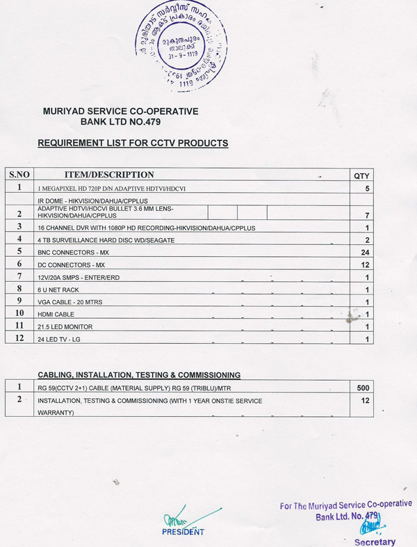 | Tender Muriyad Service Co-operative Bank No.479 Requirement List for CCTV Products | ||